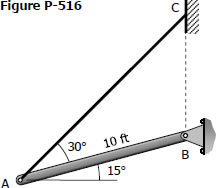 A timber beam AB, 6 in wide by 10 in deep and 10 ft long, is supported by a guy wire AC in the position shown in Fig. P-516. The beam carries a load, including its own weight, of 500 lb for each foot of its length. Compute the maximum flexural stress at the middle of the beam.